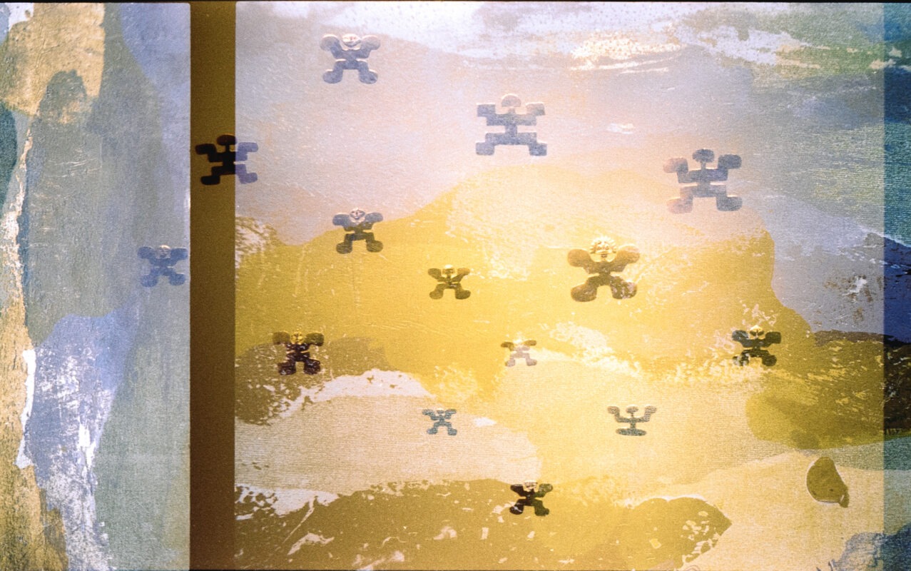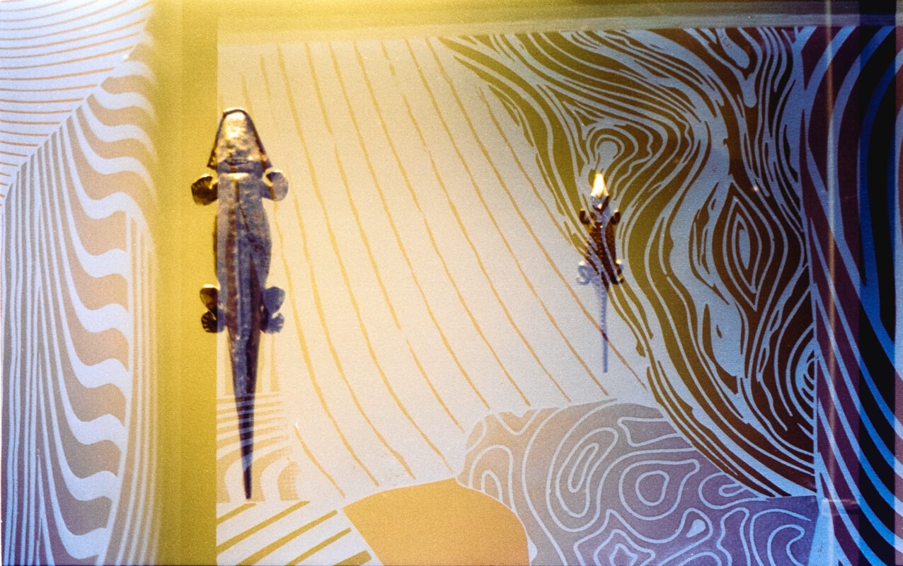 Abya Yala’s goldsmiths made these pieces as offerings to the land and imprints of their memory. Generations of people buried gold with the deceased in guacas (ancient burial sites) throughout the continent: from the Darién jungle to the Río de la Plata. Colonizers looted these sacred tombs to melt the pieces into gold ingots that they sent to Europe. The pieces that have been preserved ended up captive in private collections and museums. The unseen journey of the film rolls from Colombia to Spain evokes the path that the gold ripped away from the soil of Abya Yala travelled to enrich Europe. In these images, the ancient goldsmith pieces meet contemporary artworks and free themselves from the museum space in the abstractions of mountains and rivers depicted in our prints and paintings.