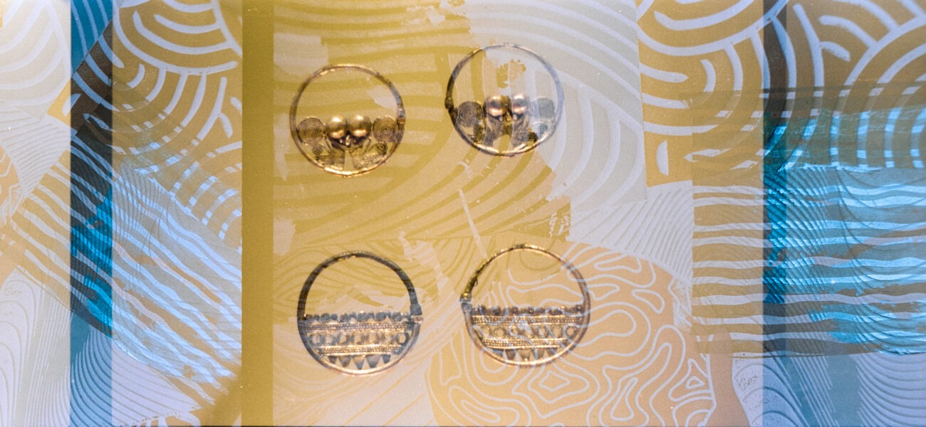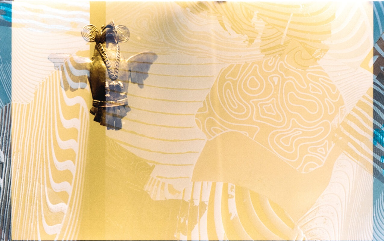 This is a series of double exposure analog photography. The project began in Bogota, Colombia, where we photographed prehispanic goldsmith pieces at the Gold Museum. Months later, we sent the film to Barcelona, Spain, where we inserted it in another camera to overlay the images of the prehispanic pieces with photographs of our artworks. This series highlights the goldsmith tradition that indigenous peoples perfected for thirty centuries until colonization destroyed the practice.