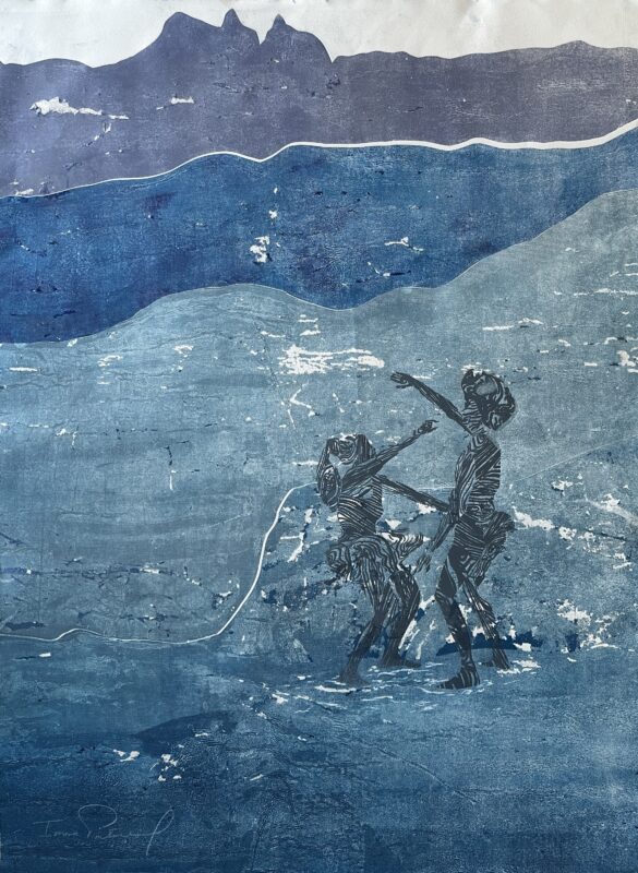 This print is about memory, resistance and territory. In the image I depict Mapalé: a dance that was born in black communities in the Caribbean coast of Colombia to endure and feel liberated in the midst of abuse in colonial times. The couple dancing in the water and the foam of the ocean is reminiscent of the mapalé fish, after which the dance is named because it moves with strength when taken out of the water. For me, the fish, as well as the dance, symbolizes the will to hold on to life and resist. The backdrop landscape is the Sierra Nevada de Santa Marta, a unique mountain range that sits right next to the Caribbean Sea and rises up to more than 5000 meters high. These mountains next to the sea speak to us of origin and strength: a vast territory that safeguards stories from its millenary peoples and keeps their cultures alive.
